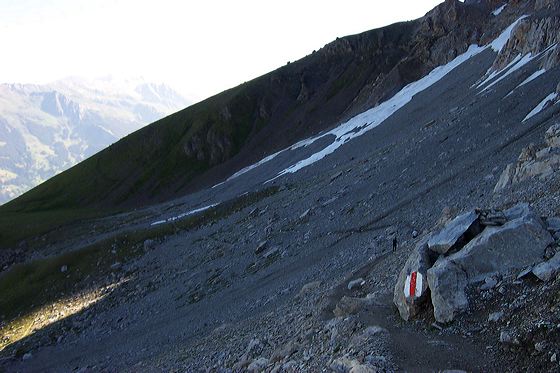 Jon headed out solo to walk the Eiger Trail, from the Eigergletscher station to Alpiglen. The splash of white-red-white marks the otherwise-hard-to-see mountain trail. (For a sense of the scale of this huge mountain, note the tiny figure of another hiker in the middle foreground.) 7/16/04 9:02:43 AM