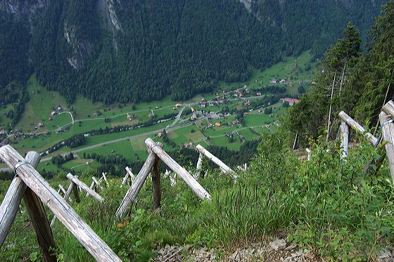 A recent avalanche had torn down this precipitous slope above the village of Lütschental, visible 2,300 feet (700 meters) below — nearly twice the height of the Sears Tower. The wooden structures are built to help prevent future avalanches. 7/16/04 4:57:11 PM