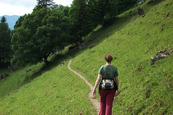 Ann threads the trail cutting along the steep slopes of In den Lauenen, toward the old, round trees that reminded us of a Winnie-the-Pooh landscape. 7/18/04 3:48:53 PM