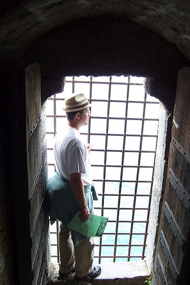 The castle of Chillon is built right out on an outcropping in the waters of Lac Léman (Lake Geneva). The excellent self-guided tour takes you through the whole castle, from dungeon to tower. Here Jon ponders the immortal poetry of former prisoner Lord Byron. (Not really.) 7/20/04 1:33:56 PM