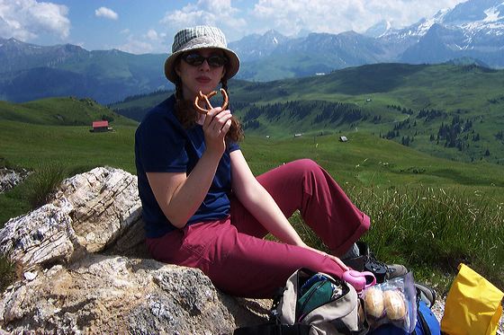 Our lunches were a highlight, with sandwiches made from creamy cheese and tangy local dried meats. And we won't forget these big, buttery pretzels. Here's Ann lunching just past the Trütlisbergpass. 7/21/04 12:11:27 PM