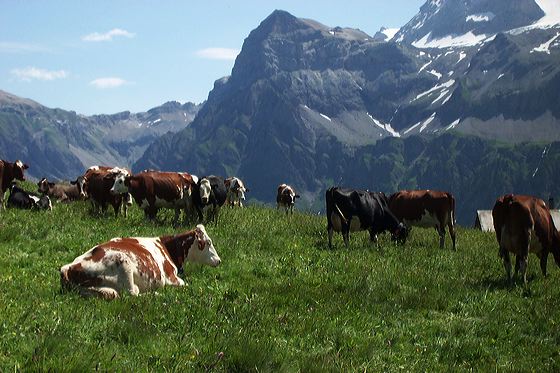 These cows get to see the view of the Ammertenhorn and Wildstrubel from Langermatte every day (at least, when it's clear). But for us, it was a spectacular treat. We were on our way to a spur trail up the Oberlaubhorn, after climbing from Iffigenalp — a total ascent of 1,640 feet (500 meters), our greatest climb of the trip. 7/22/04 11:56:57 AM