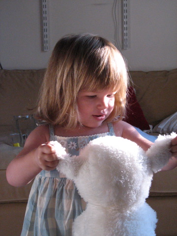 It’s “Jumbo Lambie,” an oversized stuffed lamb. She’s got a fake, electronic “baa-aa!” when you press one of its paws. When she bleats, Lucy shouts, “Lambie speaks!” :) Reply